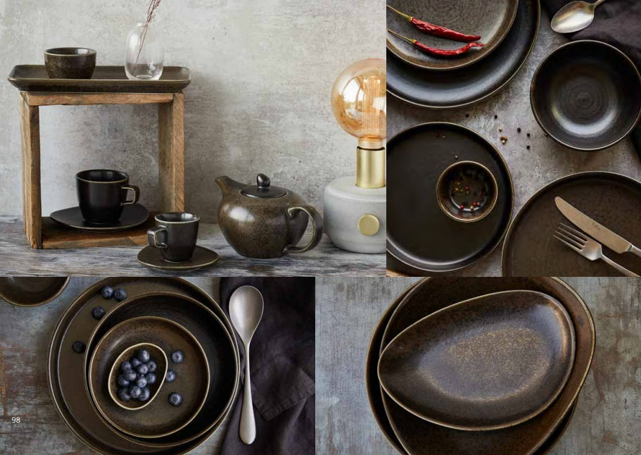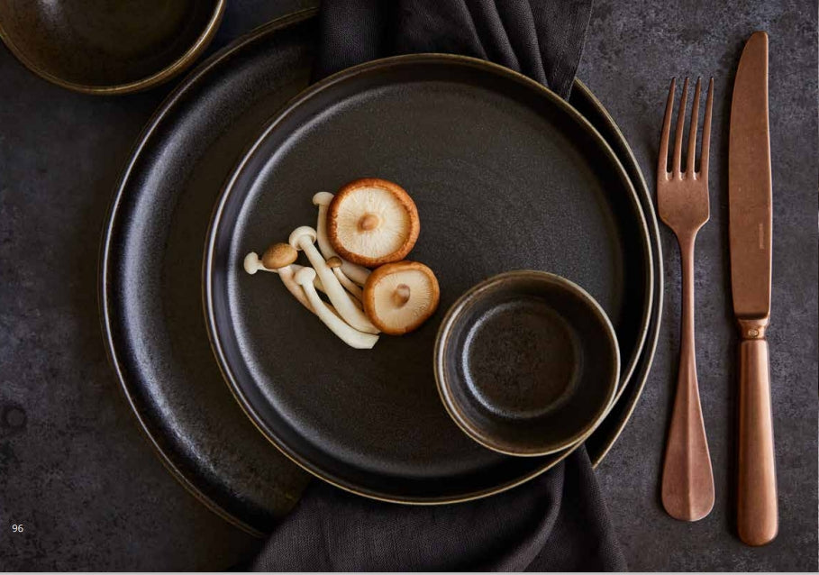 The richness and depth of colour as seen through the glowing embers of the fire. Enhanced by a stunning shimmer effect which is achieved through the matt black and bronze glaze finish. The items shimmer in the light giving each piece its own beauty and unique character. A rustic design with a high-end feel, making it ideal for Asian and Fusion cuisine and high-end steak houses.