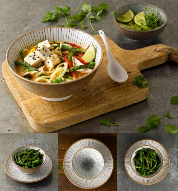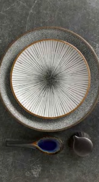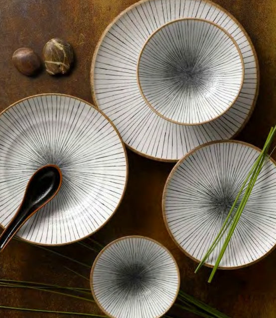 Inspired by the natural world, in a classic colour combination to bring a striking and vibrant look to the table. Earth Lines is made up of a stunning white glaze with fine black lines, drawing your eye in to the centre of the piece. The outside of the items are in a natural golden-brown glaze which also acts as an edge band to the design, giving the range a softer more rustic feel. Available as a short range of plates and bowls, designed to work with all types of food and cuisines. Mix and match with other ranges in the collection such as Earth Crackle and Swirl to create striking table presentation.